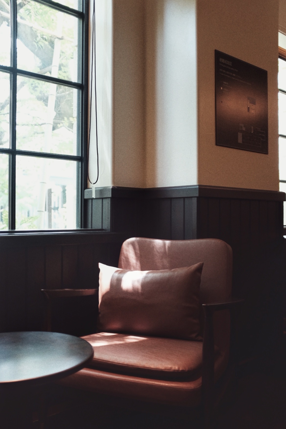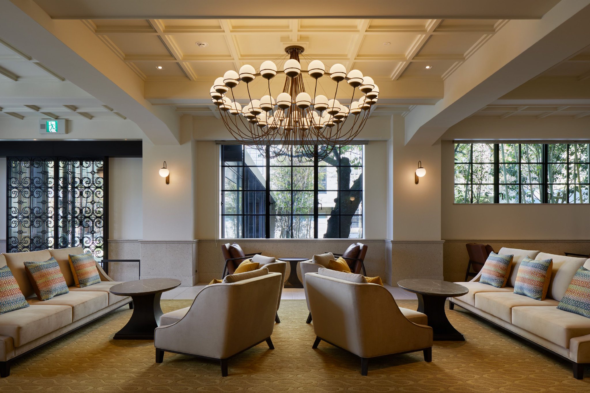 Lobby 不大,却得体,藏在一扇暗纹自动门里。天花板用了老学校的格子吊顶设计,一盏圆形枝状吊灯像是一种温和的仪式感。米色沙发围坐在正中,靠窗的光线刚好落在木纹茶几上,给人一种“欢迎你回到旧时光”的错觉。