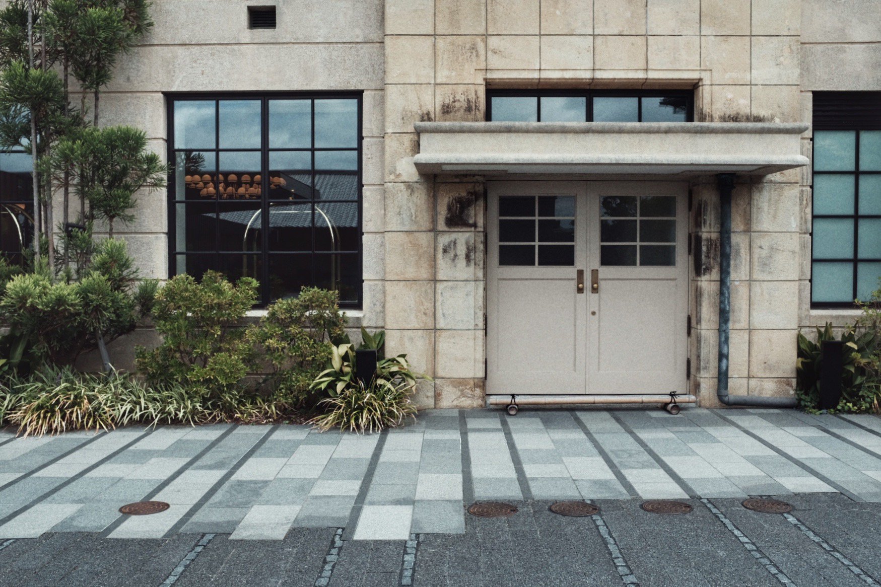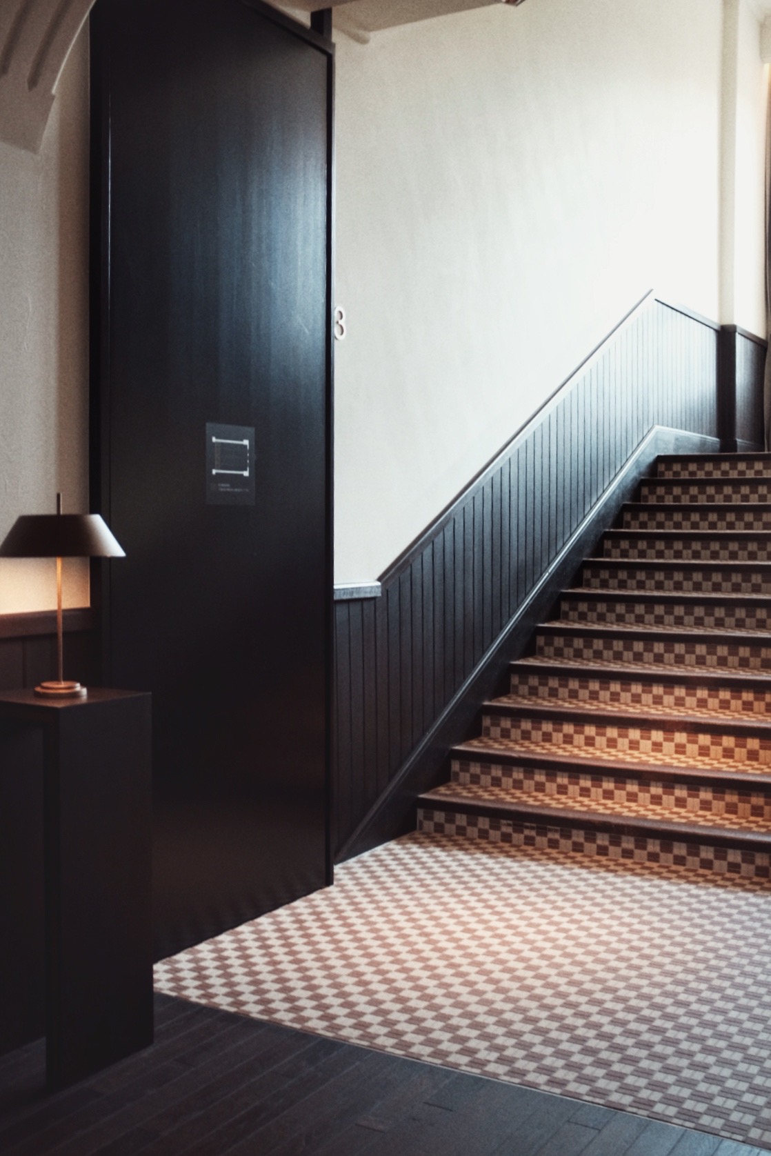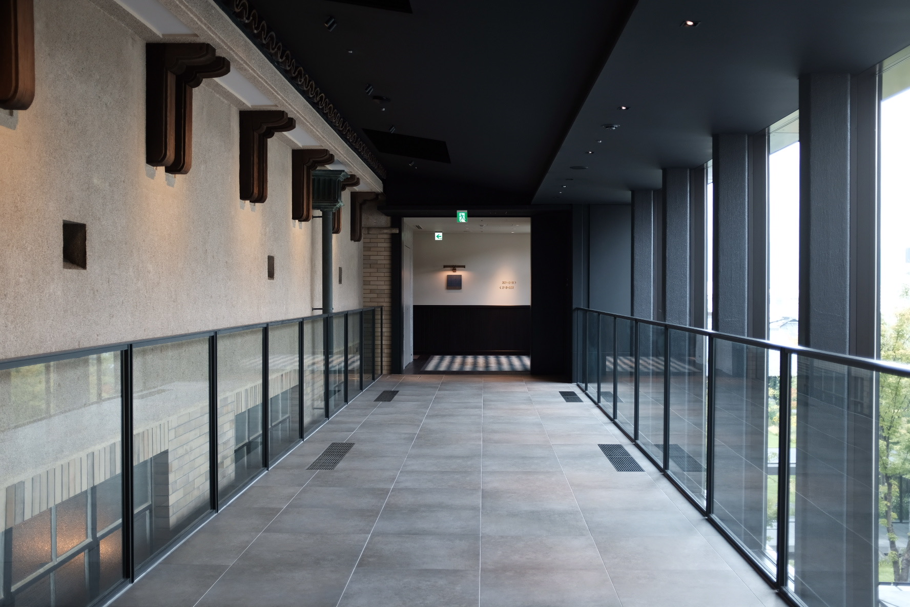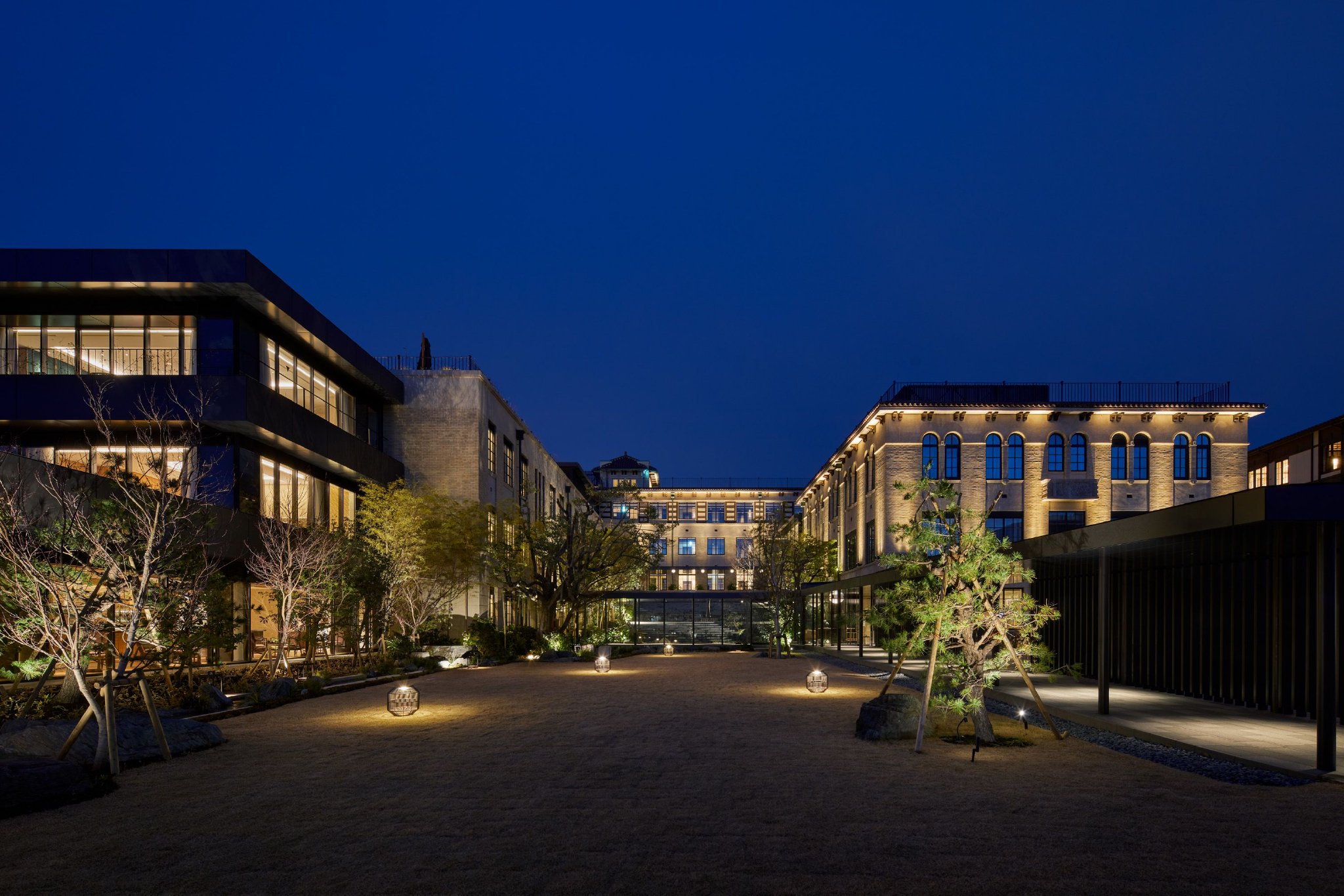 穿过鸭川,再往东山,街道变窄,游客却始终随在左右。路过祇园后转角上坡,尽头便是清水寺,然而我们到了半山腰便转进了一处静谧的广场和草坪,到了这次目的地:京都清水青龙酒店。酒店是由京都清水小学改造而来。校舍为砖造结构,混合西洋比例与日式细节:厚重的檐口搭配纵横的窗框。改造后加入立鼎世酒店联盟成为其中一员,从挂在墙上的旧照片来看,建筑外观形式虽变,肌理却未动。