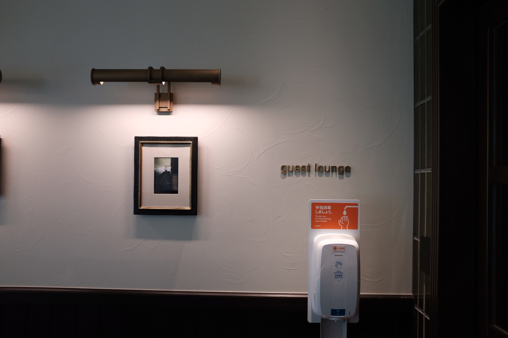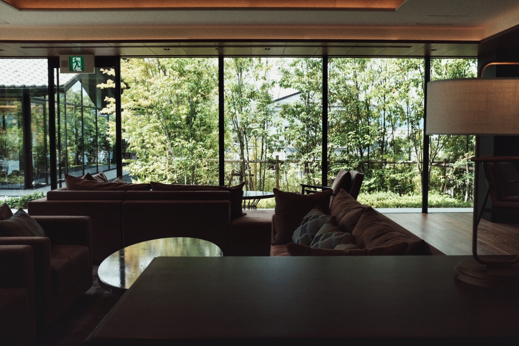 除了主楼空间,两个配套公区也格外出色。其一是全天开放的酒廊(Guest Lounge),位于校舍一侧,藏身于一处展台之后,提供各类咖啡、啤酒、清酒与甜点。沙发与柔光并置,有点像图书馆,又不全是。人少时在此落座,是东山罕见的“安静空间”。透明玻璃窗,屡屡阳光洒入室内,八坂塔就在树荫后若隐若现。
