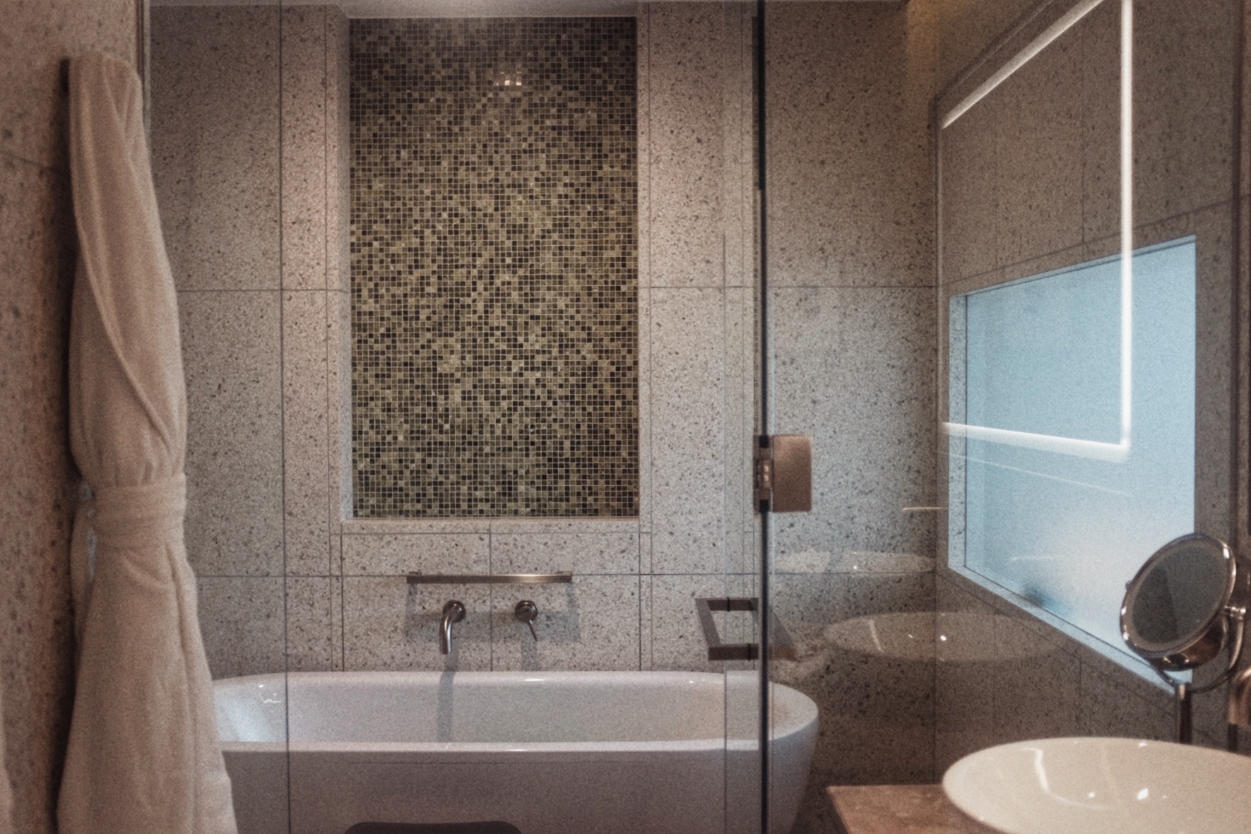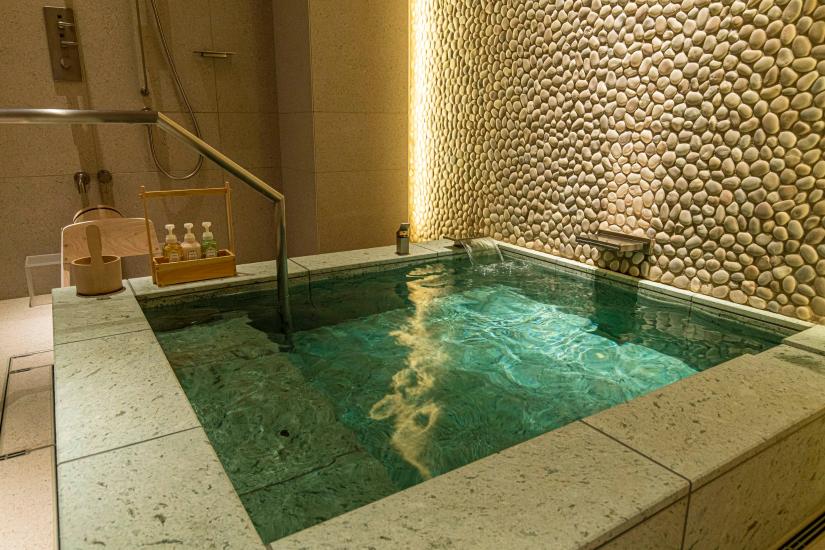其二是需预约使用的私人汤池,设在一处独立小院内。裸露的鹅卵石墙面,热气氤氲中微见庭石,空间不大,却带着日式沐浴的完整仪式感。这里不追求奢华,而是通过“节制”达成私密。