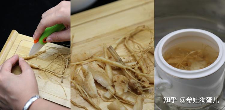 园参鲜品、园参生晒、园参段/条、园参生晒参片、红参全须、红参光支、红参压块、鲜林下参、林下参生晒、鲜野生参、野生参生晒、鲜纯山参/纯野山参、纯山参/纯野山参生晒等,都可以依照此方法进行,只是在完整的人参情况下,可以将鲜品切片或切段,生晒参品可在蒸锅1-2分钟,蒸软后切片、切段或切碎块,当然也可以揪着吃,从须开始,掐一点儿,当然购买到现成的片就根据克重片数进行食用即可。