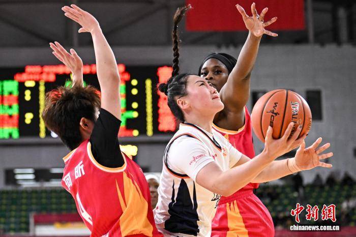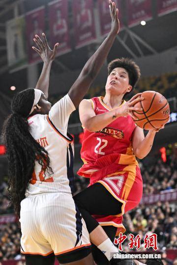 1月9日,山西队球员埃格博(红衣)在比赛中防守。当日,在太原举行的2025-2026赛季中国女子篮球联赛(WCBA)常规赛第14轮比赛中,山西竹叶青酒队主场以96比73战胜新疆天山队。中新社记者 韦亮 摄