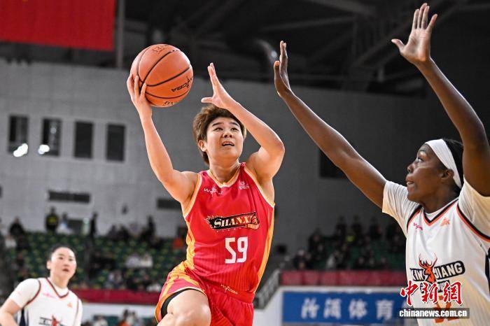 1月9日,山西队球员张懿(红衣)在比赛中上篮。当日,在太原举行的2025-2026赛季中国女子篮球联赛(WCBA)常规赛第14轮比赛中,山西竹叶青酒队主场以96比73战胜新疆天山队。中新社记者 韦亮 摄