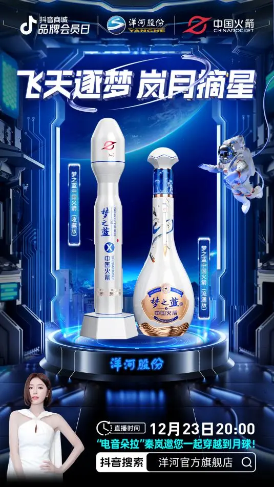 作为中国白酒行业的领军企业之一,洋河始终以创新为核心驱动力,近年来,洋河积极拓展线上销售渠道,不断探索和尝试互联网新营销模式,并通过创意直播活动形式,成功吸引了大量年轻消费者的关注。在2023年12月23日至29日期间,洋河在抖音平台的“洋河官方旗舰店”开展了品牌会员日活动。其中,12月23日还进行了新品「梦之蓝中国火箭」的全网直播,此次活动不仅进一步提升了洋河品牌的影响力和知名度,同时也通过3D建模搭建的科技场景,为消费者带来了全新的购物体验。