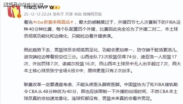 这样的结果,显然不是我们想要的,以至于媒体人付政浩老师都忍不住了,“看完cba新赛季揭幕战,更大的感触莫过于,外援四节七人次赛制下的FIBA这种40分钟比赛,每个队配置四个外援,比赛因此完全沦为了外援二对二,本土球员彻底功能化和边缘化,只能拉边看外援表演。”
