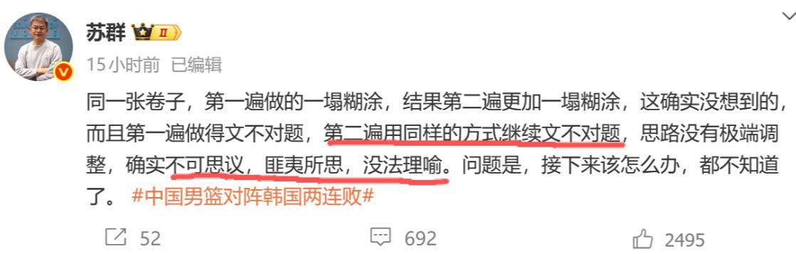 赛后名嘴苏群发文暗指郭士强没有任何调整:“同一张卷子,遍做的一塌糊涂,结果第二遍更加一塌糊涂,这确实没想到的,而且遍做得文不对题,第二遍用同样的方式继续文不对题,思路没有极端调整,确实不可思议,匪夷所思,没法理喻。问题是,接下来该怎么办,都不知道了。”