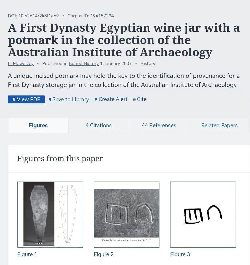 》(A First Dynasty Egyptian wine jar with a potmark in the collection of the Australian Institute of Archaeology),澳大利亚的考古研究所里面,收藏着一件带有“陶器符号”的酒罐,这个陶罐属于古埃及王朝时期,时代范围 约是公元前3100年—前2900年,论文截图如下: