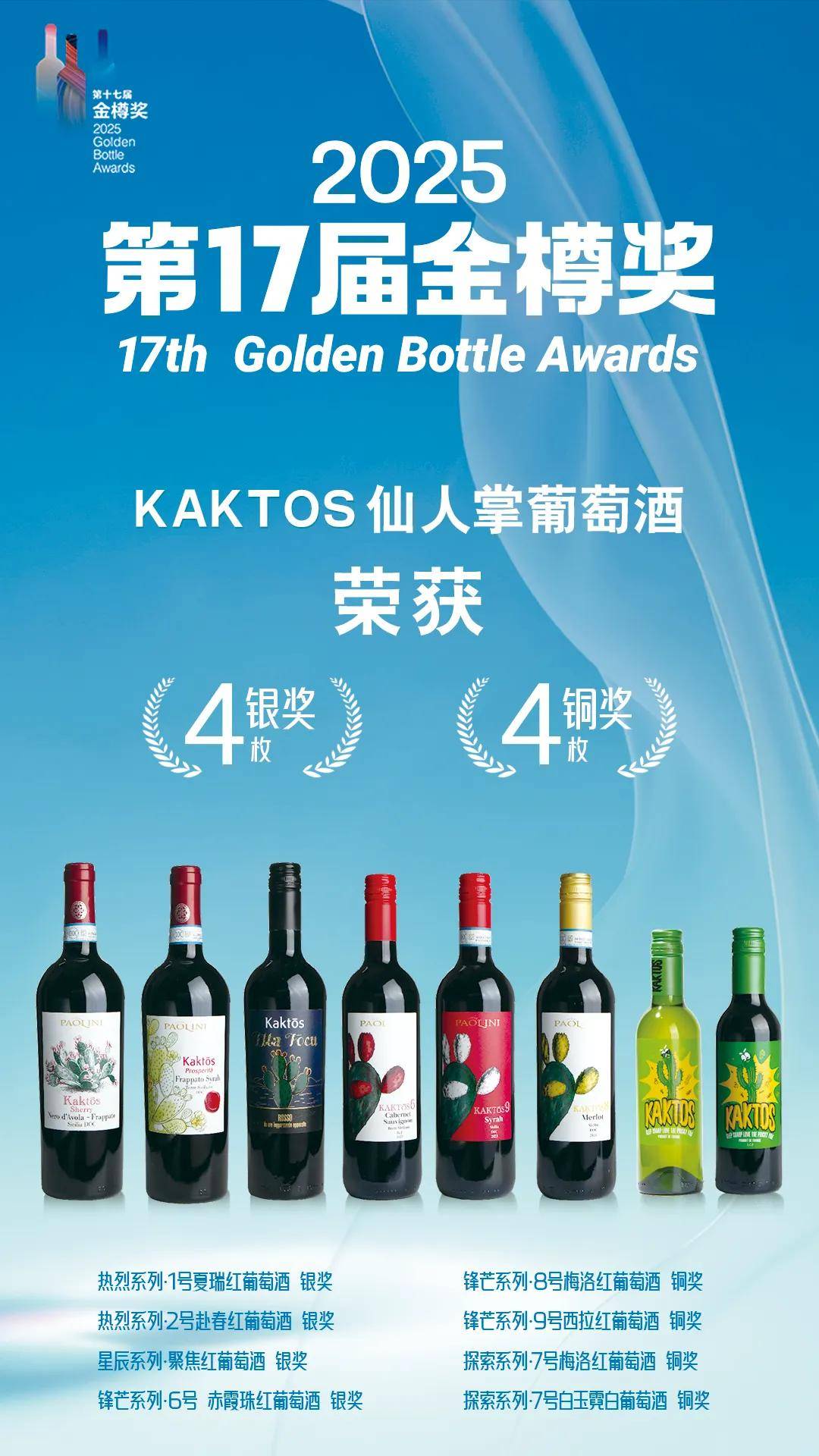 近日,第十七届葡萄酒行业权威奖项 “金樽奖” 评选结果揭晓,KAKTOS仙人掌葡萄酒凭借全系列产品脱颖而出,一举斩获 8 枚金樽大奖。