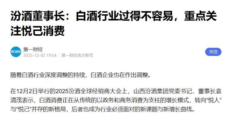 据财经12月2日报道,山西汾酒集团党委书记、董事长袁清茂表示,白酒消费正在从传统的以政务和商务消费为支柱的增长模式,转向“悦人”与“悦己”并存的新格局,后者也成为行业必须面对的新课题与新增长曲线。相较于行业中一些白酒巨头还在坚持走高端路线,袁清茂可以说给白酒行业“上了一课”。