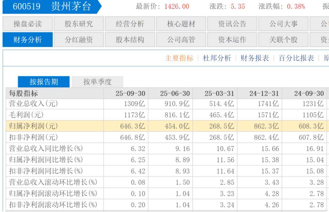 其中茅台前三季度营收1309亿元,同比增长6.32%;净利润646.3亿元,同比增长6.25%。这两项增速相比去年同期的16.91%和15.04%均出现大幅下滑。第三季度,茅台营收398.1亿元,同比增长0.35%;净利润192.2亿元,同比增长0.48%,自茅台上市以来出现营收和净利润增速跌破1%的局面。去年同期两项增速分别是15.56%和13.23%。