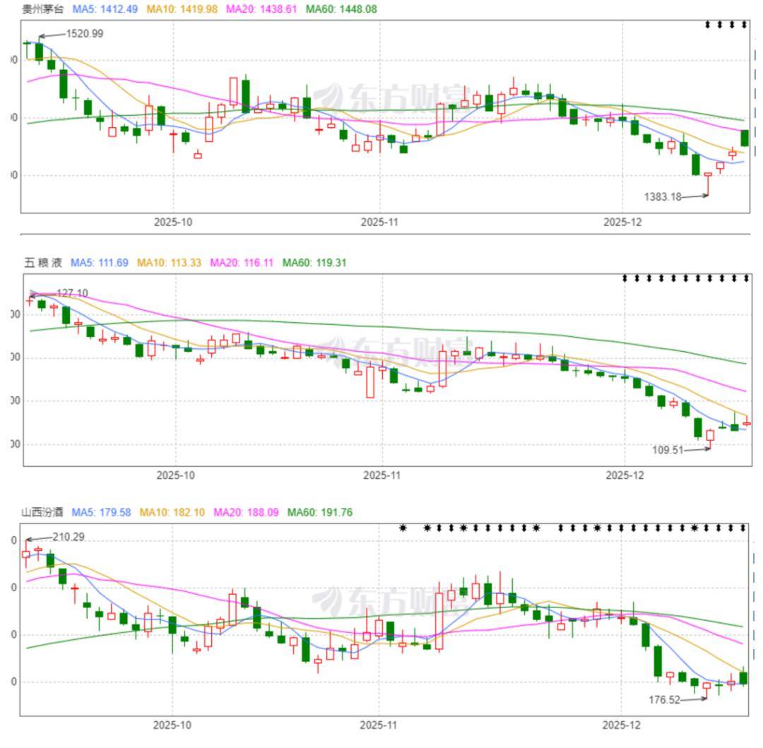 随着几个白酒巨头不同的消息释出,三大白酒巨头股价都出现较大波动。茅台在2024年12月31日收盘价为1524元,截至12月15日股价为1426元,年内跌幅为6.4%。同期五粮液股价跌幅达19.70%。汾酒同期股价跌幅为2.53%,汾酒成为股价跌幅最小的一家,抗跌性更强。茅台、五粮液和汾酒的最新市值为1.786万亿元、4365亿元和2191亿元。从市盈率上看,茅台龙头企业规模明显,以19.86的市盈率稳居,汾酒18.01紧随其后,五粮液市盈率为15.35。