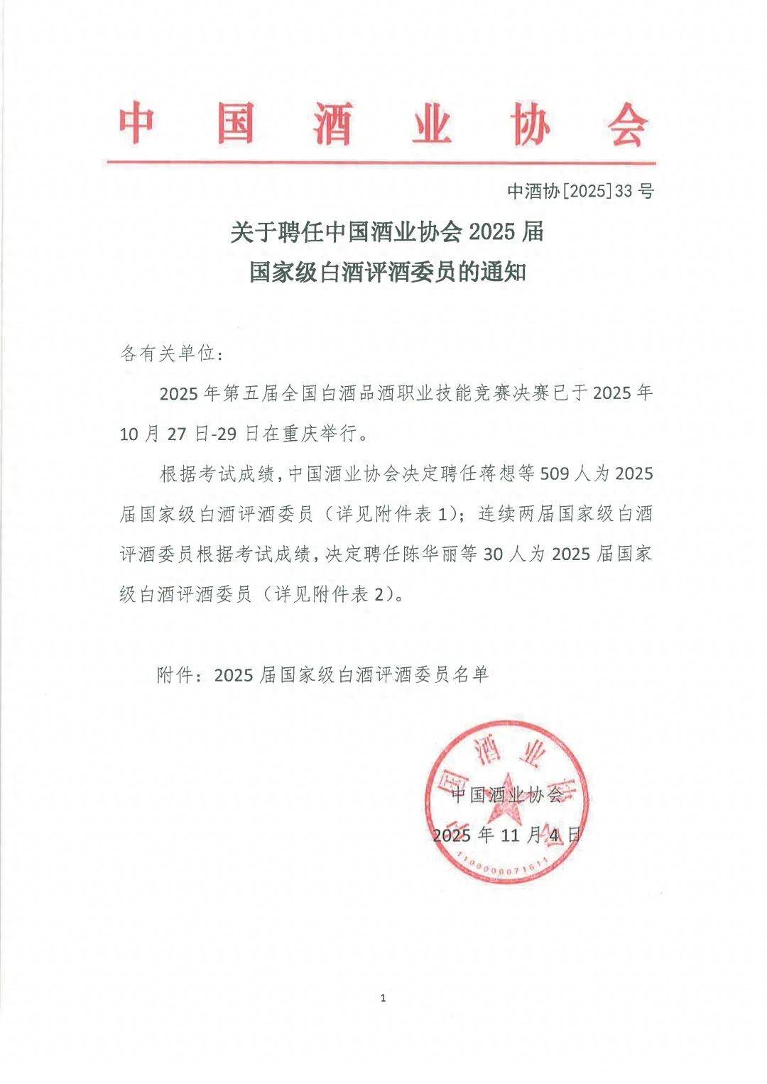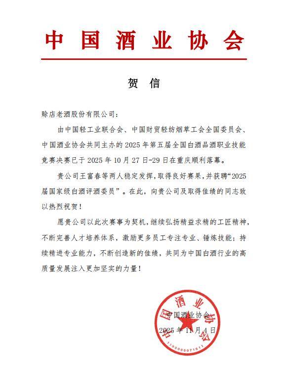11月4日,中国酒业协会下发了《关于聘任中国酒业协会2025届白酒评酒委员的通知》,通知公布了2025届白酒评酒委员聘任名单。来自赊店老酒的魏玉伟和王富春凭借其炉火纯青的品评技艺与对白酒风味的深刻洞见,成功通过决赛,被正式聘任为2025届白酒评酒委员。