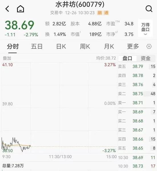 12月26日,水井坊(600779.SH)低开,截至10:30股价报38.69元/股下跌2.79%,领跌白酒板块。而在昨日午后,水井坊股价突然拉升,后直接以涨停收官,领涨整个白酒板块。