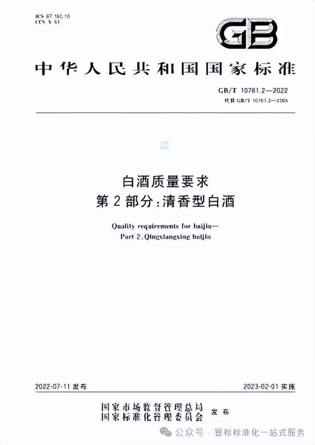 今天,我们就来为大家详细解读GB/T 10781.2-2022《白酒质量要求 第2部分:清香型白酒》。这项标准已于2022年7月11日发布,并于2023年2月1日正式实施。