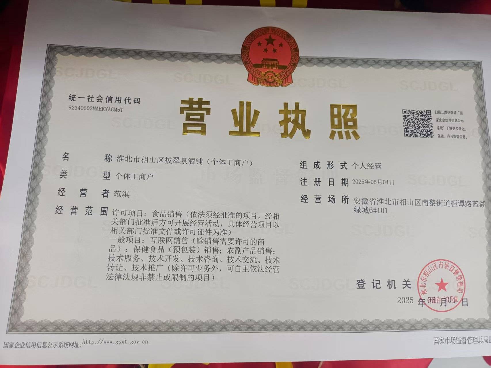 中国淮北拔翠泉老酒铺,由酿酒大师、品酒大师、连续四级届专家评委王振环先生技术总把控,中国知名作家、散文学家张行方先生作《拔翠泉酒赋》,中央电视台九套专题采访中国画家任彧大师设计logo,中国淮北书法家纵宁先生题字,范淇女士开创散酒品牌拔翠泉,“出类拔萃喝好酒,喝酒就喝拔翠泉,三分之一价格喝名酒,要喝就喝拔翠泉,五粮之上,唯有老酒”。技术精益求精,做人出类拔萃,酒品追求,主要业务:招商加盟各市县拔翠泉散酒代理,各类企事业订制各类白酒,家庭订制封坛酒喜宴酒等,白酒主要来源于四川邛崃,贵州茅台,山东景芝,山西吕梁,广西桂林,安徽九华山等主要产品包括浓香型白酒,清香型白酒,酱香型白酒,米香型白酒,芝麻香型白酒,果香型酒,黄精酒。
