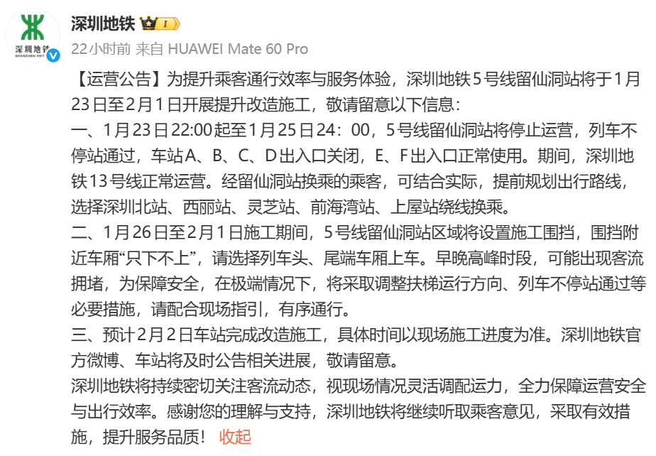 ✅1月23日22:00-1月25日24:00,5号线留仙洞站将停止运营,列车不停站通过,车站A、B、C、D出入口关闭,E、F出入口正常使用。期间,深圳地铁13号线正常运营。经留仙洞站换乘的乘客,可结合实际,提前规划出行路线,选择深圳北站、西丽站、灵芝站、前海湾站、上屋站绕线换乘。