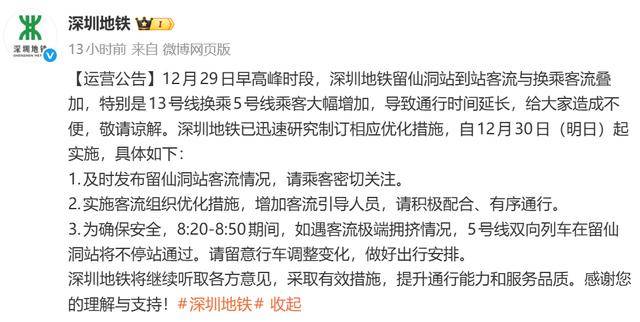 线路开通后的周一即12月29日早高峰时段,深圳地铁留仙洞站吸引大量跨区域客流在此换乘。客流快速集聚,短时间内即呈现饱和拥堵状态,导致通行时间延长,不少网友反映在留仙洞站换乘时遇到严重拥堵。对此,深圳地铁29日晚发布公告称已迅速研究制订相应优化措施,自12月30日起实施。