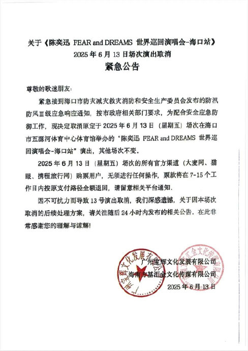 陈奕迅演唱会的门票向来一票难求。不少歌迷在网络平台发文称,为了来看这次演唱会提前赶到海口,6月12日还收到演唱会通知正常进行,13日凌晨两点主办方就发通告称演唱会取消,希望赔偿交通费和住宿费。