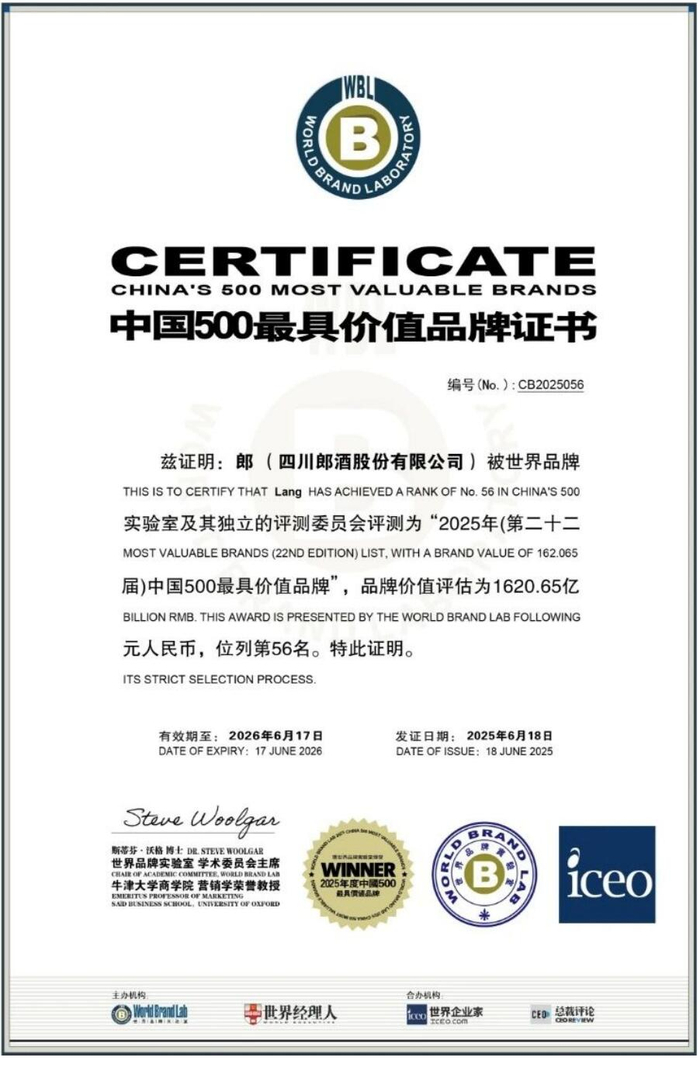 从2004年世界品牌实验室公布的41.52亿元,到品牌价值1620.65亿元、连续17年稳居白酒行业前三、酱香型白酒第二,郎酒以持续进化的品牌生命力,书写着中国白酒的全球突围叙事,为产业变革注入不可复制的“中国郎范式”。
