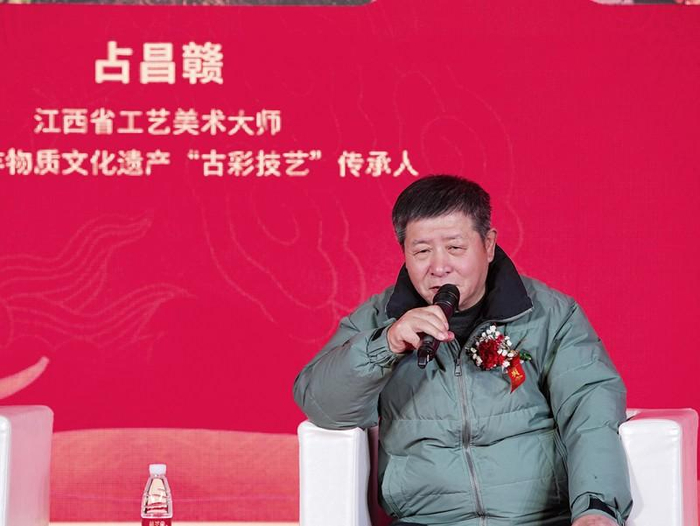 论坛中,江西省工艺美术大师、江西省非物质文化遗产“古彩技艺”传承人占昌赣讲述了古彩技艺的前世今生和古彩技艺与酒相结合的独特艺术价值。他讲到,“古彩”不但是景德镇的瑰宝,也一直受到世界美学界的高度重视与肯定,但随着社会的快速发展,“古彩技艺”需要我们不断探索创新,创作既符合现代审美又不失传统韵味的作品,提高大众的认知和接受度。