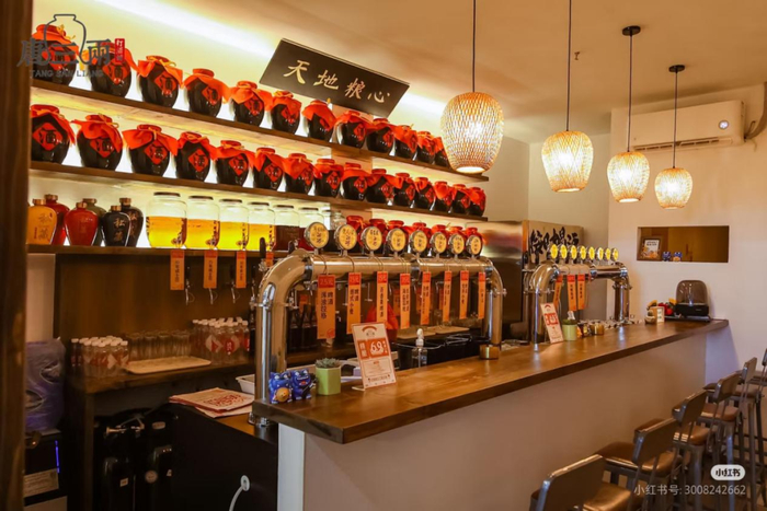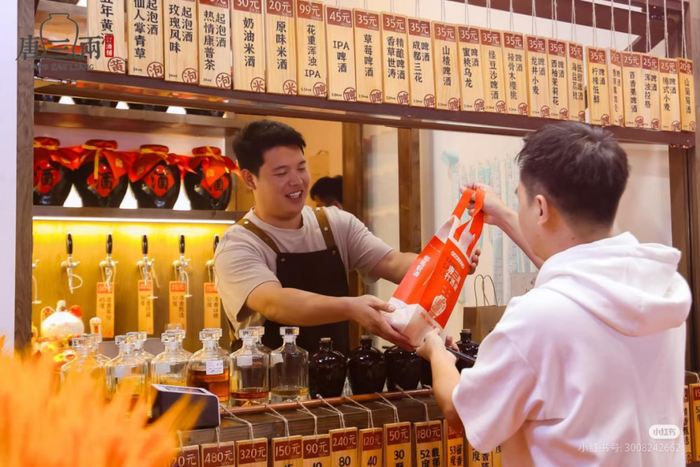 在唐三两打酒铺(以下简称唐三两)宏济新路店,糖酒快讯记者见到了创始人之一的李孟龙。店铺不大,却处处透着用心:新中式风格的装修风格,水牌上酒品有白酒、黄酒、梅子酒等,品类琳琅满目,价格从15元一斤到360元一斤,能满足多元需求。吧台后的年轻店员不时对路人发出邀请:“好喝的梅子酒,免费品尝!”后方的堂食区已经满座,新来的顾客就在门口支起小桌,就着自带的小菜小酌,气氛轻松自在。