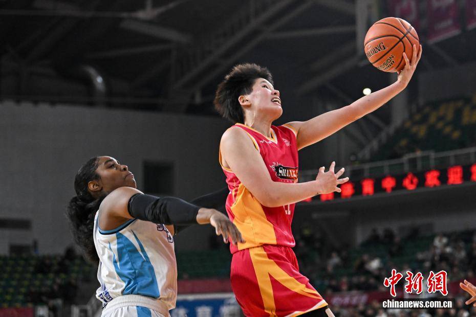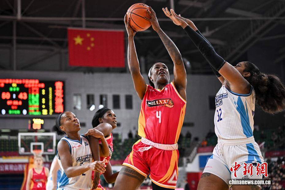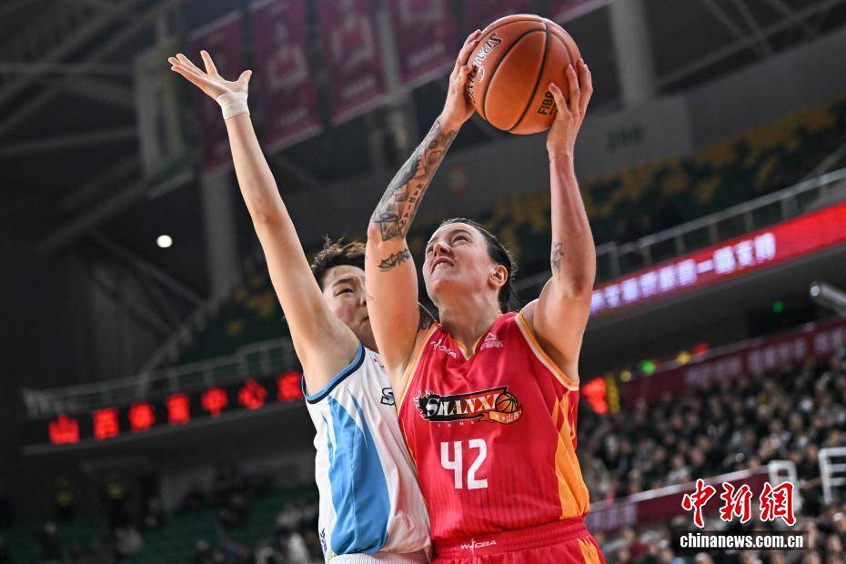1月7日,山西队球员惠特尔(红衣)在比赛中上篮。当日,在太原举行的2025-2026赛季中国女子篮球联赛(WCBA)常规赛第13轮比赛中,山西竹叶青队主场以93比75战胜山东赤水河酒队。中新社记者 韦亮 摄