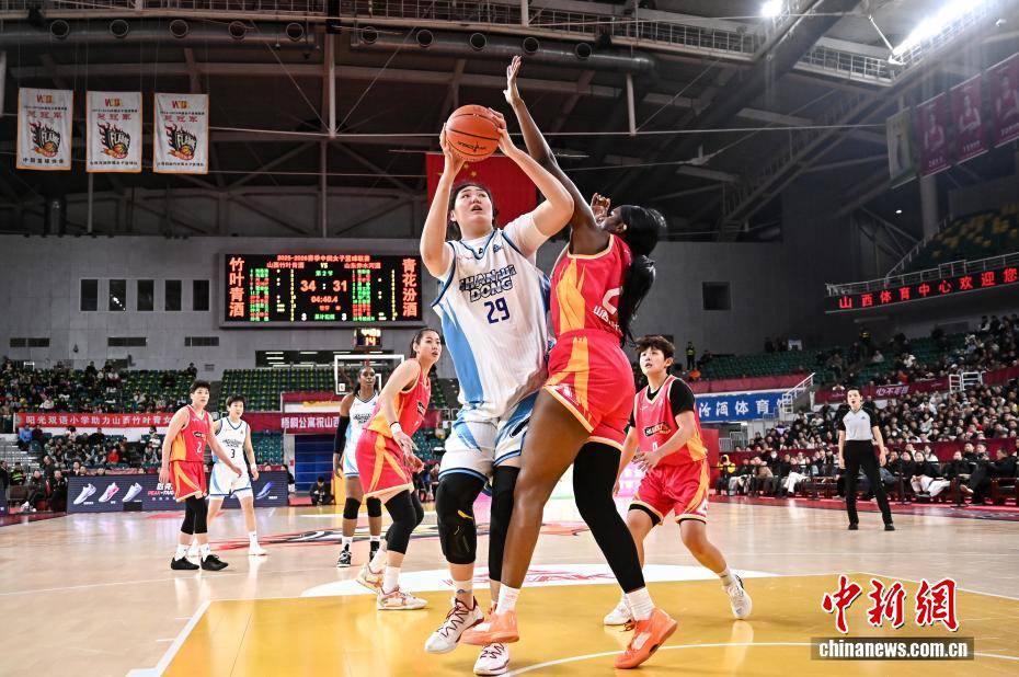 1月7日,山西队球员埃格博(红衣)在比赛中上篮。当日,在太原举行的2025-2026赛季中国女子篮球联赛(WCBA)常规赛第13轮比赛中,山西竹叶青队主场以93比75战胜山东赤水河酒队。中新社记者 韦亮 摄