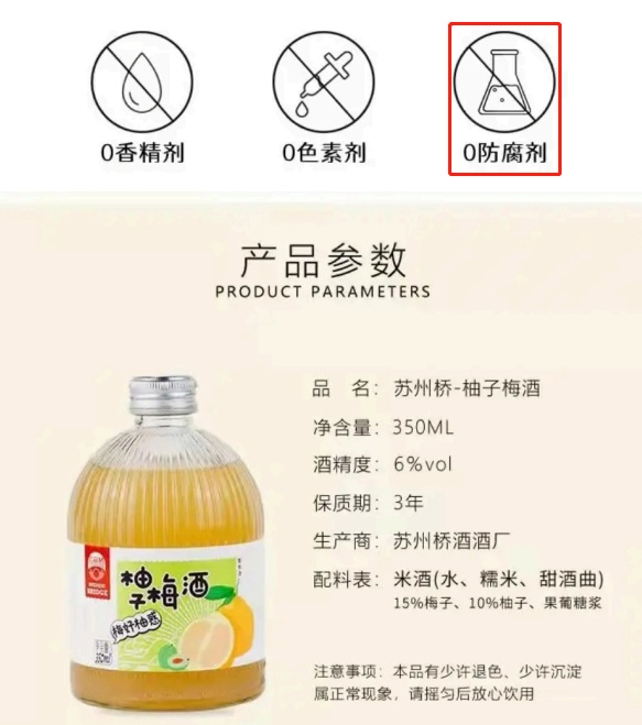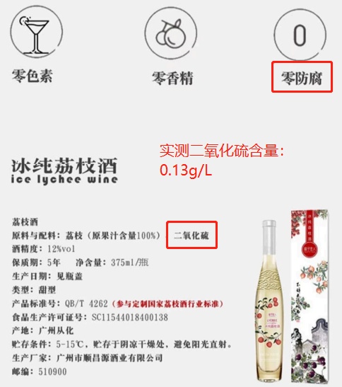 其中1款由广州市顺昌源酒业有限公司销售和生产的冰纯荔枝酒(标称商标:顺昌源;标称规格:375ml/瓶),配料表中标示含有二氧化硫,与其页面“零防腐”的宣称相矛盾。