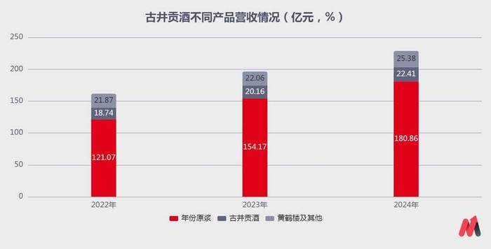 古井贡酒核心产品是“年份原浆”。2024年年份原浆收入180.86亿,古井贡酒收入22.41亿,黄鹤楼及其他收入为25.38亿,换算下来,年份原浆占总营收比例高达76.71%。结合销量来看,年份原浆吨价上涨5%,古井贡酒吨价微涨2%,黄鹤楼及其他上涨16%。年份原浆和黄鹤楼属于古井贡酒的中高端产品,可见其主要通过产品结构的调整,压降低价、低毛利率产品,实现量价齐升。这是好消息。