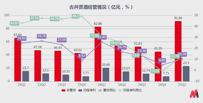 论业绩,古井贡酒算是当前白酒赛道除茅台外“最靓的仔”,2024年营收和净利分别同比增长16.41%、20.22%;25年Q1营收和净利增速仍保持双位数增长,分别为10.38%和12.84%,占了行业第二和的位置。