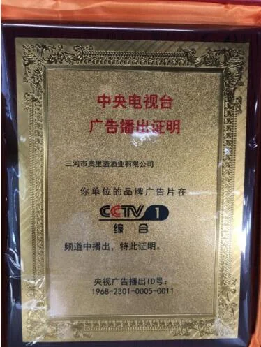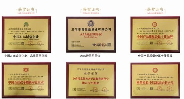 三河市奥里盖酒业有限公司陆续荣获AAA级信用单位、中国3.15诚信企业、全国产品质量公证十佳品牌、中国百佳改革创新示范企业、中央机关老干部新春团拜会指定专用礼品、质量检测-标准合格产品等。