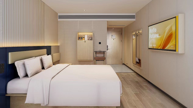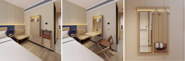 客房更是借助大规模壁挂和折叠式家居设计,实现了单房面积12-15㎡的空间优化再造,不仅大幅提高了出房率,还降低了客房套内投资成本,并且对墙面的利用也更加高效,充分释放了房间地面空间,有效破解小面积客房空间所带来的逼仄感、压抑感等痛点,再搭配产品更低30间起的房量设计,投资者可以大幅拓展自己的物业选择空间,众多城市里条件有限的社区小微物业都符合新版本产品落地要求,投资选择将更灵活、总投资成本更低。