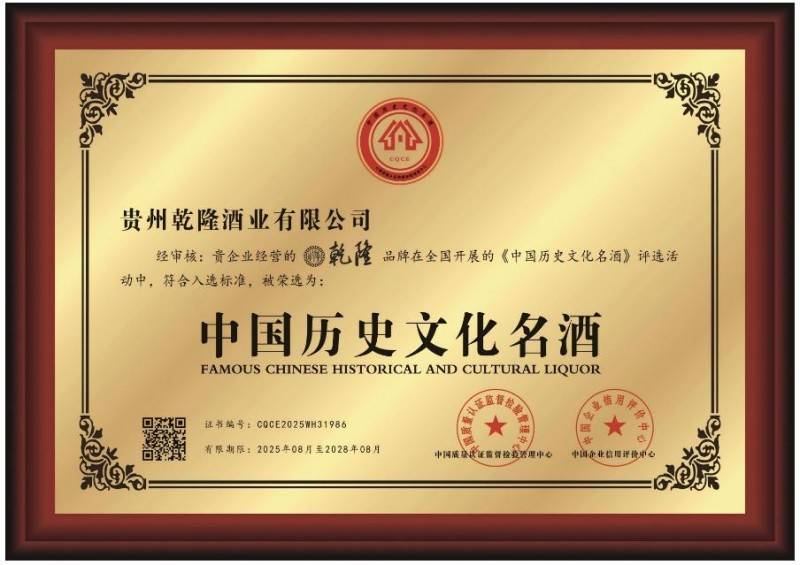 权威荣誉的加持,更让乾隆酒的品质无需多言。企业不仅荣获“省级非物质文化遗产”认证,其蒸馏酒传统酿造技艺被官方认可与保护,更斩获“巴拿马国际品牌金奖”“华樽杯中国酱香型白酒十大开拓创新品牌”“贵州”等多项殊荣,还被评为“中国历史文化名酒”“中国品牌”。这些硬核荣誉既是对其工艺传承的肯定,也是对其产品品质的优佳背书,让消费者买得放心、饮得安心。