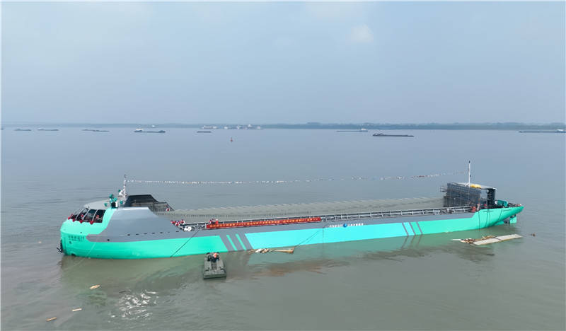 代号为“河豚蔚蓝01”的全球标准模块电池换电船在芜湖下水。弋江区委宣传部供图