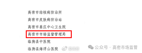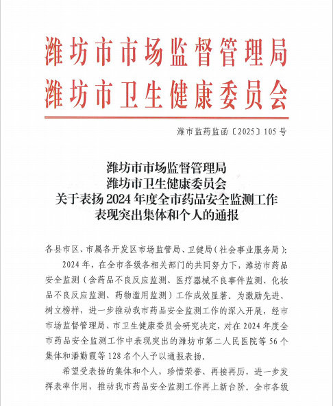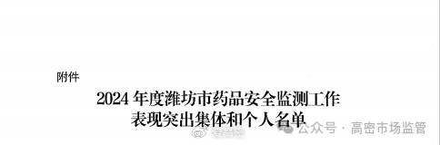 热烈祝贺!在《潍坊市市场监督管理局潍坊市卫生健康委员会关于表扬2024年度全市药品安全监测工作表现突出集体和个人的通报》(潍市监药监函〔2025〕105号)中,高密市市场监督管理局被光荣授予 “2024年度潍坊市药品安全监测工作表现突出集体”称号!
