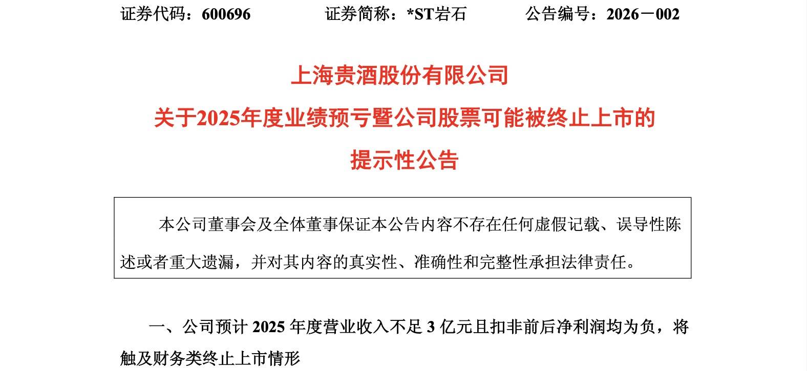 1月12日,当*ST岩石(600696.SH)正式发布那份市场早有预期却依然沉重的公告时,其长达三十余年的资本市场旅程,似乎终于听到了清晰的倒计时读秒声。公告称,经初步测算,公司预计2025年度营业收入将低于3亿元,且利润总额、净利润或扣非净利润中至少有一项为负值。根据《上海证券交易所股票上市规则》,这意味着公司股票将因触及财务类退市情形而被终止上市。这是一份迟来的“诊断书”,它确诊了一家公司在经历无数次概念转换与名称更迭后,其主营业务的内核终于无力再支撑起上市公司的外壳。