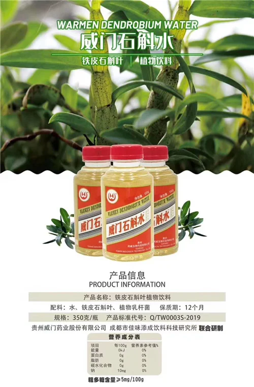 而威门药业在威门石斛水的研发上,采用了现代科技技术,经威门全资子公司“贵州同威生物科技有限公司”独有的生物发酵工艺精提而成,更大化保证了石斛有效成分的提取及对活性成分的保留,最终研发而成的威门石斛水水体颜色呈淡淡的黄色,为植物本色,水体其中主要起作用的成分就是石斛粗多糖。在与朋友聚会、商务应酬之时,喝酒前饮用,则补充水分;开怀畅饮时佐酒饮用,则可稀释酒精,减少刺激;饮酒后饮用,更可缓解酒后不适,助消费者饮酒更健康。