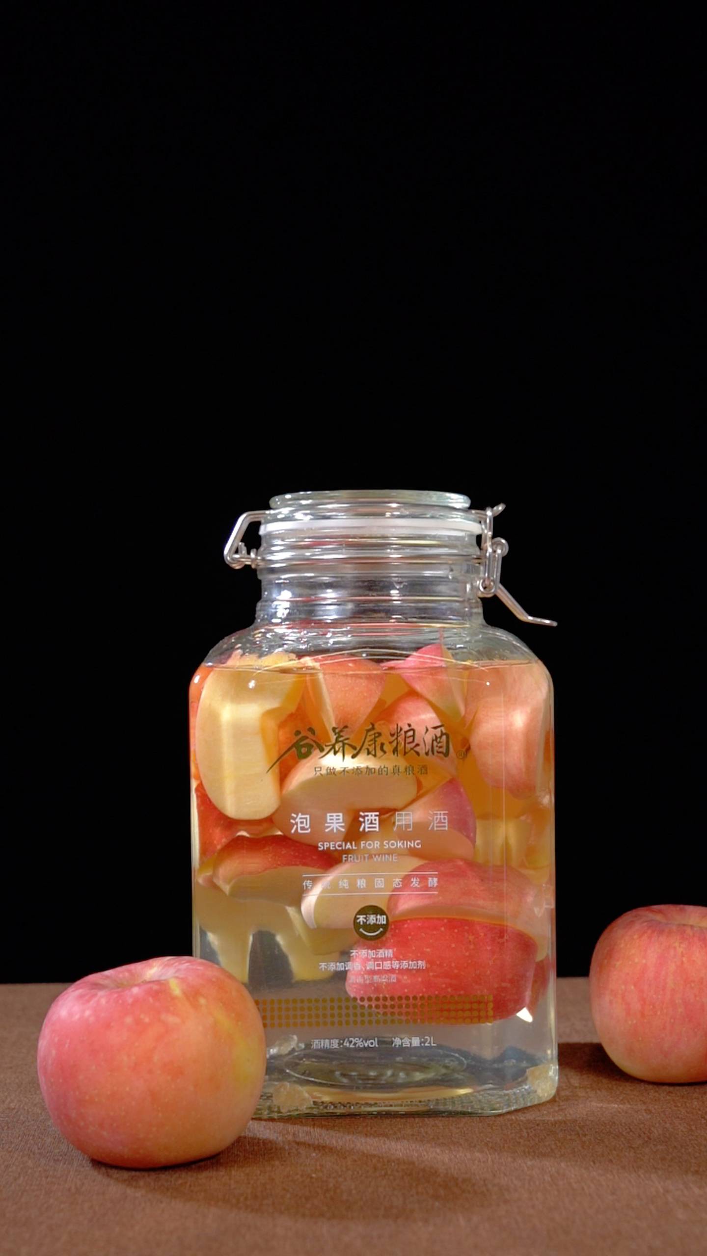 不过,泡苹果酒最关键的还是选酒——选不对,再好的苹果也白费。之前我试过浓香型白酒(曲味盖果香)、伏特加(太烈刺激)、低度米酒(两个月就发酸),直到后来才找到门道。这里和大家说点真心话:泡酒选择需小心,否则浪费水果又伤身。这些年我试过不少酒,发现很多便宜白酒是食用酒精+添加剂勾调的,泡出来的果酒难喝不说,长期喝还可能有问题。所以选酒一定要选0添加的纯粮食酒。而清香型小曲白酒特别适合泡水果,它有几个突出优势:1.香气纯净,不会抢水果风头,完美展现苹果天然果香;2.成分温和,低酸低酯,和水果兼容性好,口感更协调;3.萃取效果佳,能让苹果的果香物质溶出率更高;4.喝着舒服,杂醇油含量极低,比其他香型低很多,醒酒快不上头;5.用途广,泡樱桃、杨梅、花草都合适。经过多次测试,清香型小曲白酒确实是泡水果酒的更佳选择。比如谷养康·纯粮泡酒专用酒就是这种类型,我用它泡过苹果、樱桃、杨梅,每一次都成功,果香浓郁入口顺滑。再提醒几个注意事项:1.必须选0添加纯粮食酒,优先清香型小曲白酒;2.泡水果酒选42度足够,太低易变质,太高盖果香;3.容器用玻璃的,塑料不行,长期接触会溶出塑化剂;4.所有材料和容器无油无水,否则易发霉。