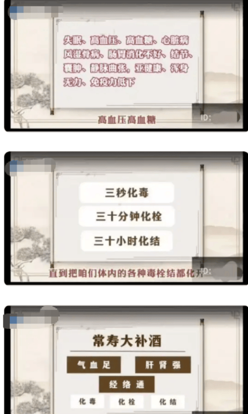 群内主推的“奇酒访谈”节目中,一位名为 “陆军” 的老师宣称,“常寿大补酒”具有 “三秒化毒、三十分钟化栓、三十小时化结” 的神奇功效,对一体多病的患者疗效极好。
