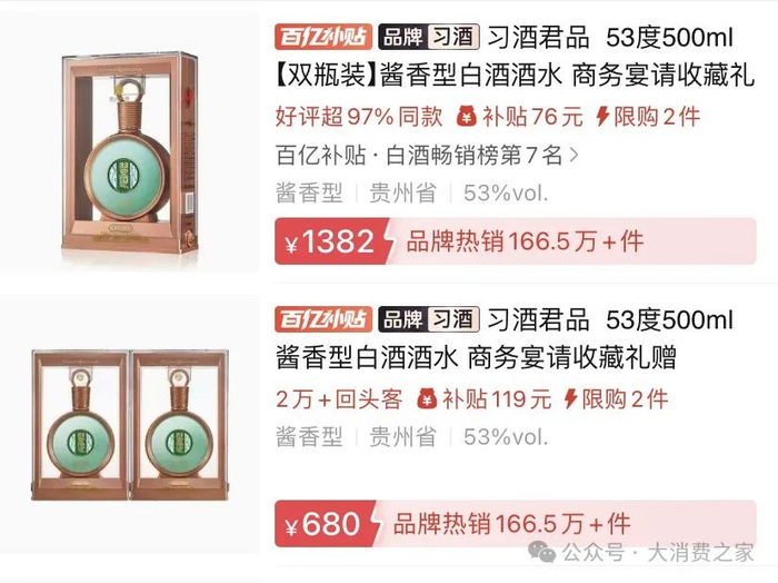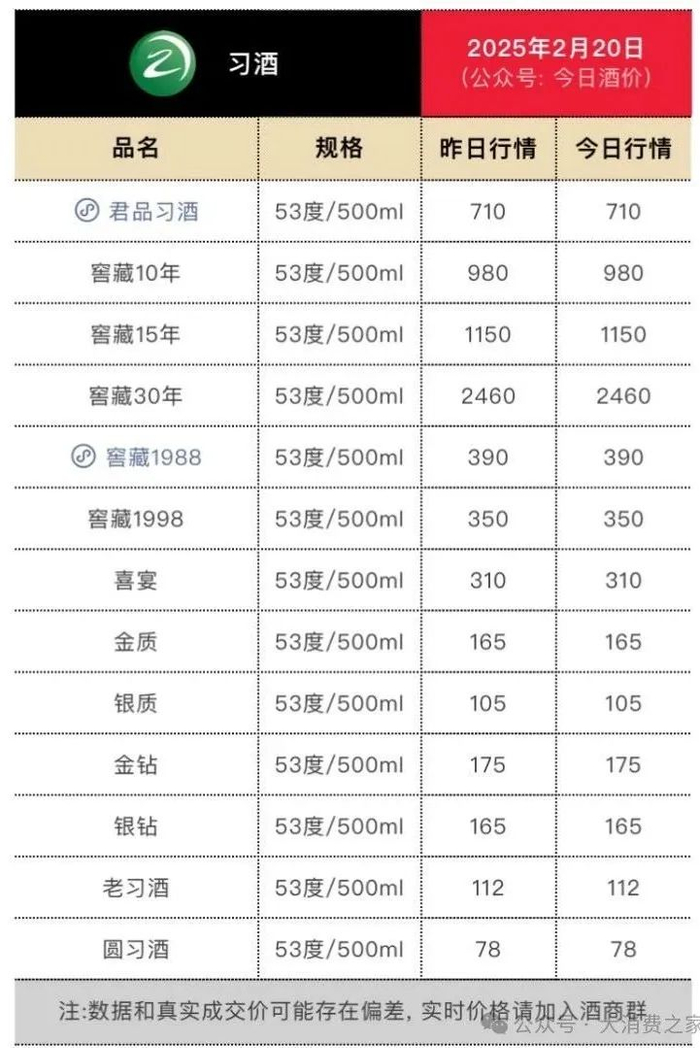 与习酒·窖藏1988情况类似的是,另一个大单品君品习酒同样出现了价格倒挂。该产品官方指导零售价为1498元/瓶,出厂价为935元/瓶。然而,截至2025年2月20日,其批发参考价已降至710元/瓶。在某电商平台,君品习酒的售价进一步低于批发价,单瓶售价为680元,两瓶装售价为1382元。