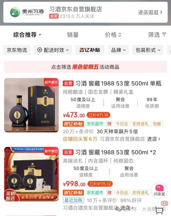 数据来源:今日酒价此外,习酒·窖藏1988的官方建议零售价为898元/瓶,出厂价为568元/瓶。然而,据某电商平台自营店铺的信息显示,目前53度窖藏1988的售价为单瓶473元,两瓶装为998元,均低于其出厂价和建议零售价。
