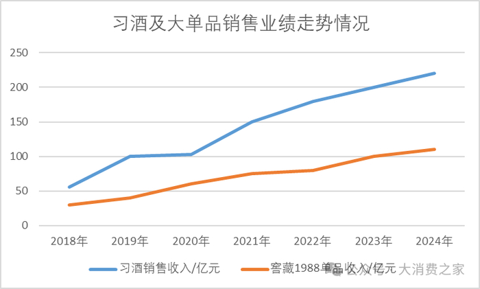 实际上,受益于酱酒市场的火热,,近年来习酒营收增长势头一直较为强劲。2018年,习酒的收入约为56亿元,而到2024年,其营收规模相比2018年近乎翻了四倍。在此期间,习酒分别在2019年和2023年突破了100亿元和200亿元的营收大关。