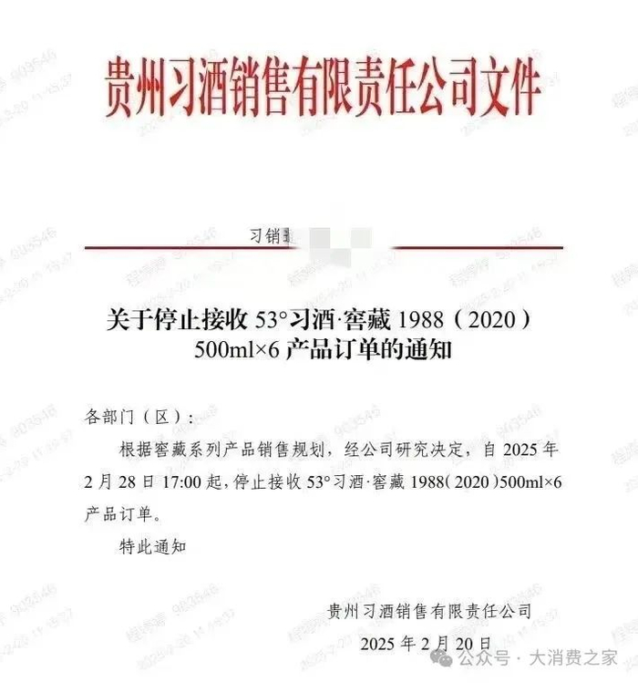 2月20日,贵州习酒销售有限责任公司发布通知,宣布自2025年2月28日17:00起,正式停止接收53°习酒·窖藏1988(2020版)500ml×6规格产品的订单。这一举措或与市场策略调整、产品升级或库存管理有关,引发了行业内的广泛关注。