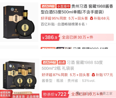 图片来源:京东更为令人关注的是,在另一电商平台参与“百亿补贴”活动后,习酒·窖藏1988的价格进一步下探,出现了单瓶386.9元、双瓶722元的售价,这种价格倒挂现象愈发显著。这或反映出当前该单品在市场上正面临着供需失衡问题,尤其是在电商平台的促销策略下。