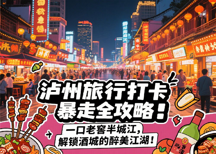 Day1:酒魂初醒上午:泸州老窖旅游区(封坛仪式)→ 中午:珠子街啃麻辣鸡 → 下午:张坝桂圆林骑行 → 夜晚:醉酒城灯光秀+白糕配啤酒