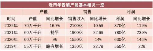随后四年,白酒行业迎来黄金十年的下半场。在知名企业的带动下,以及成義焼坊等酱酒企业押注市场化运作,同步助推酱酒行业的飞升。到2012年,酱酒产能已达到40万千升,销售收入540亿元,利润总额180亿元,均实现了跨越式提升。