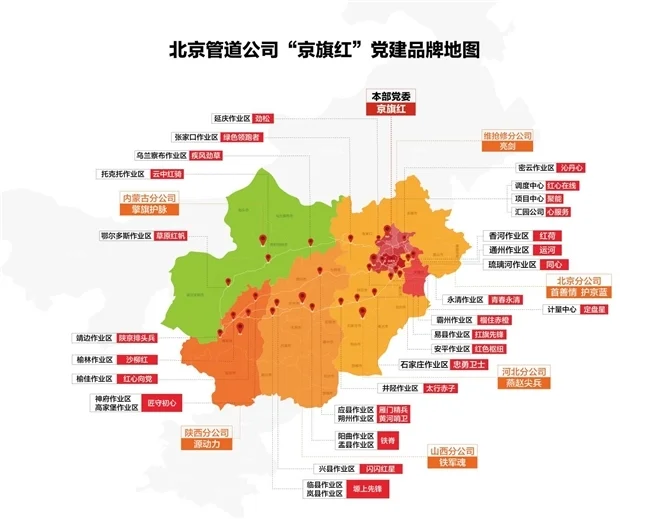 在“京旗红”党建品牌引领下,北京管道公司所属各分公司立足地域特质与业务特点,因地制宜打造出“源动力”(陕西)、“铁军魂”(山西)、“擎旗护脉”(内蒙古)、“燕赵尖兵”(河北)、“首善情·护京蓝”(北京)等9个子品牌。这些子品牌既承接了“京旗红”的核心内涵,又以差异化实践为其注入鲜活生命力。
