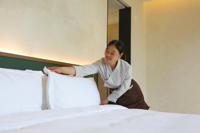 村民祝云菲正在整理酒店床铺 摄:熊秋敏