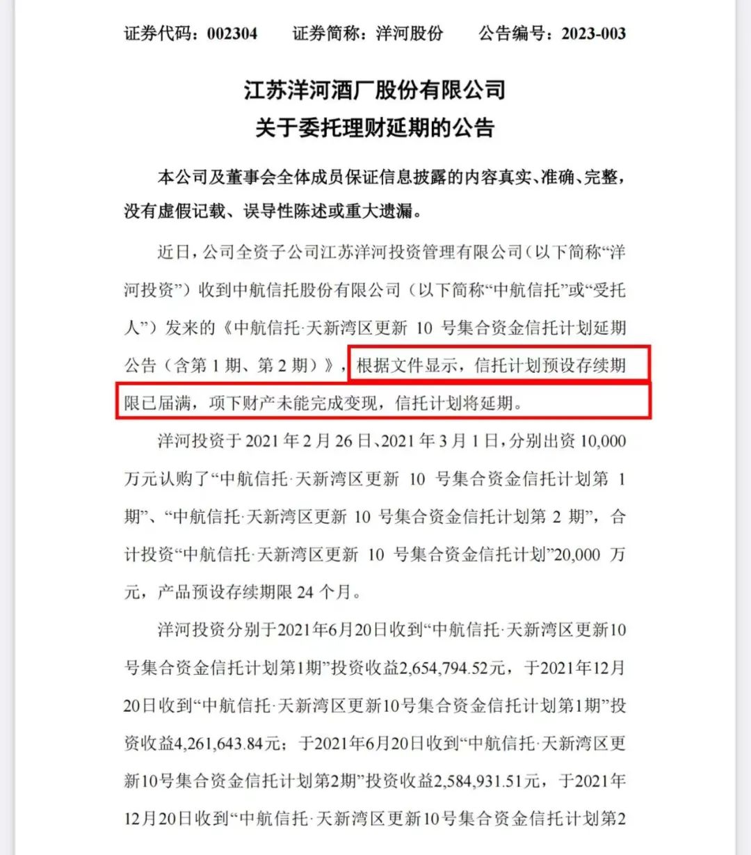 早在今年3月,洋河股份就曾公告称,公司共收到“中航信托·天新湾区更新10号集合资金信托计划”投资收益0.14亿元。截至公告日,信托产品本金2亿元及在2021年12月20日之后的预期收益未收回,信托计划将延期。