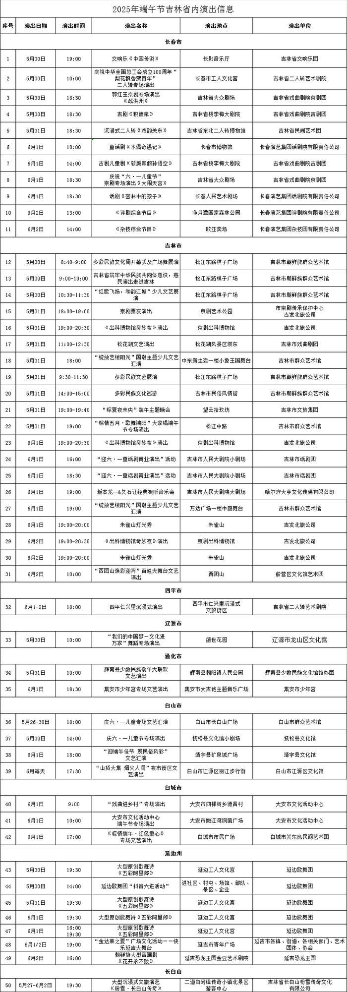 2025年端午节期间,吉林省文化和旅游厅统筹全省各地推出系列文艺演出活动,涵盖二人转、交响乐、京剧、吉剧、儿童剧、民族歌舞等50余场精品演出,打造一场吉韵悠长的文化盛宴,精彩纷呈,值得期待!